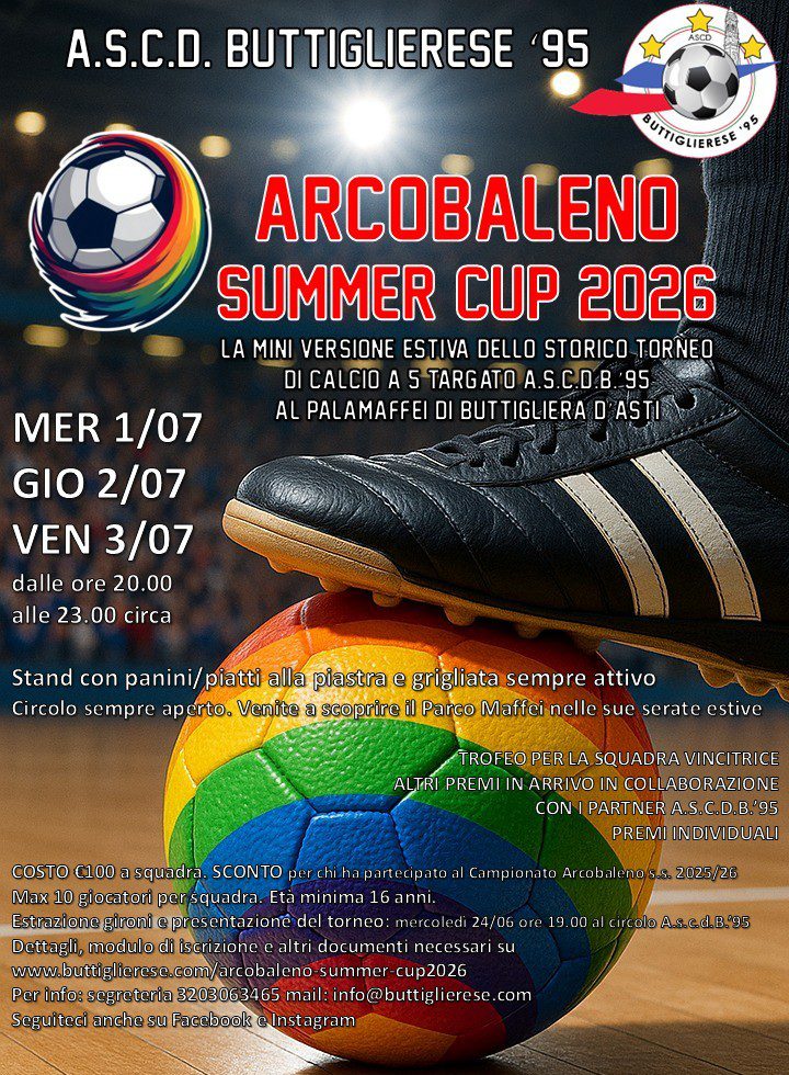 Dopo la rinascita del Campionato Arcobaleno, storico torneo amatoriale di calcio a 5 targato A.s.c.d.B’95, durante questa stagione sportiva 2025/26, arriva la mini versione estiva: l’Arcobaleno Summer Cup 2026. L’età minima per partecipare è 16 anni, il costo dell’iscrizione è di € 100 a squadra (pagabili in contanti o con Satispay). Per le squadre che hanno partecipato al Campionato Arcobaleno s.s. 2025/26 è previsto uno socnto che dimezza la quota ad €50. Le partite si svolgeranno nelle serate mercoledì, giovedì e venerdì tra le ore 20.00 e le ore 23.00 circa (magari un po’ oltre il venerdì). Durante la manifestazione saranno attivi il servizio bar e lo stand gastronomico con panini/piatti alla piastra e la grigliata. Per chi non l’ha mai provato vi invitiamo a scoprire le serate estive nei nostri dehors all’aperto nello splendido Parco Maffei. Al termine dell’evento si svolgeranno le premiazioni: trofeo per la prima classificata e premi individuali per miglior giocatore, capocannoniere e per il miglior portiere. Sono in via di definizione altri premi aggiuntivi in collaborazione con i partner della Buttiglierese ’95.