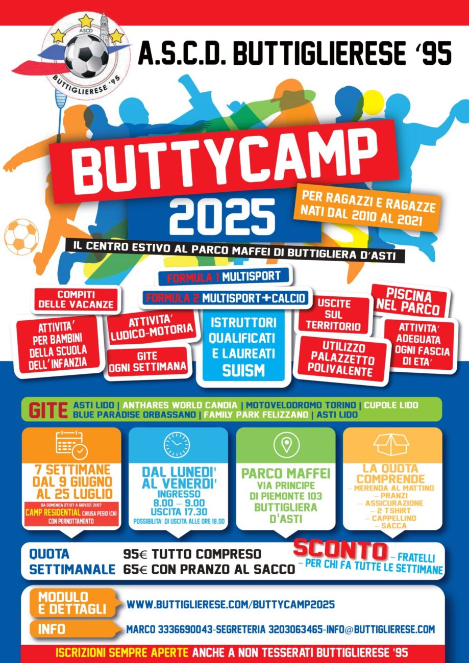 - Bonifico bancario: intestato a A.S.C.D. BUTTIGLIERESE ’95 – Banca C. R. ASTI al seguente IBAN: IT09Q0608547260000000025023 con la causale: Iscrizione Butty Camp 2025 Nome Cognome N. settimana (opzione consigliata!)