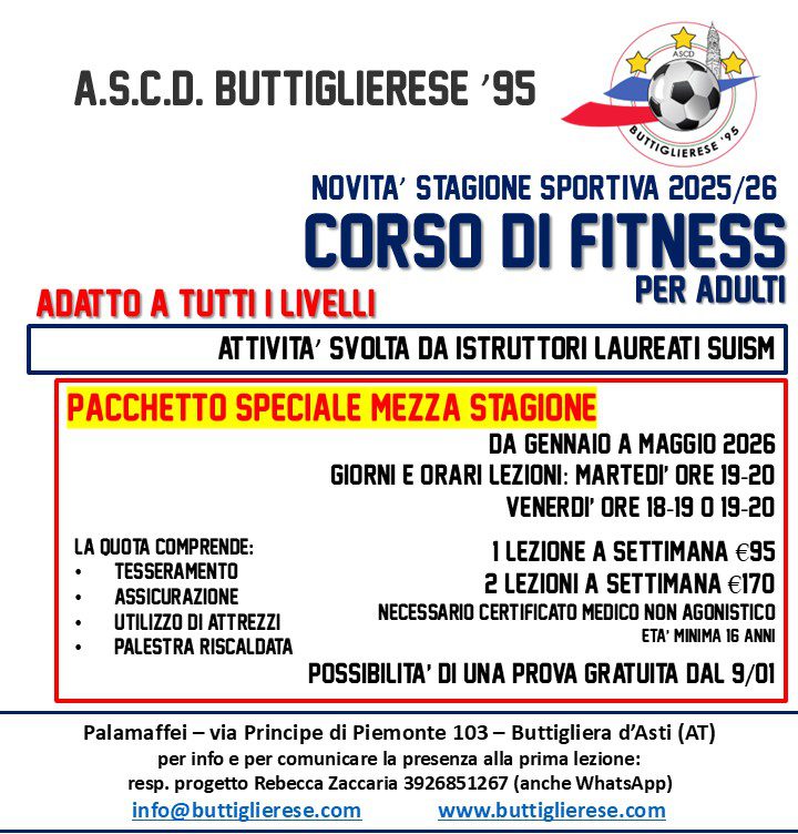 Riportiamo nuovamente il documento pubblicato ad inizio stagione con tutte le informazioni per quanto riguarda tesseramento e documenti necessari: Foglio Informativo Corso di Fitness 2025-26. Non considerate la parte per le quote di iscrizione che si intendono per la stagione intera mentre quelle per questa seconda parte da gennaio a maggio 2026 sono quelle indicate in locandina e riportate di seguito: €95 una lezione a settimana, e €170 con due lezioni a settimana.