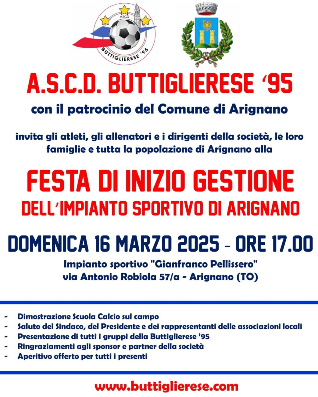 L’A.s.c.d. Buttiglierese ’95 con il patrocinio del Comune di Arignano invita gli atleti, gli allenatori e i dirigenti, le loro famiglie e tutta la popolazione di Arignano alla Festa di inizio gestione dell’impianto sportivo di Arignano che si terrà domenica 16 marzo 2025 a partire dalle ore 17.00 presso l’impianto sportivo “Gianfranco Pellissero” sito in via Antonio Robiola 57/a a Arignano (TO). Alleghiamo di seguito la locandina promozionale e sotto andiamo a spiegare più nei dettagli il programma dell’evento. Ringraziamo il giunta di Arignano per aver riconosciuto il patrocinio del Comune alla nostra iniziativa.