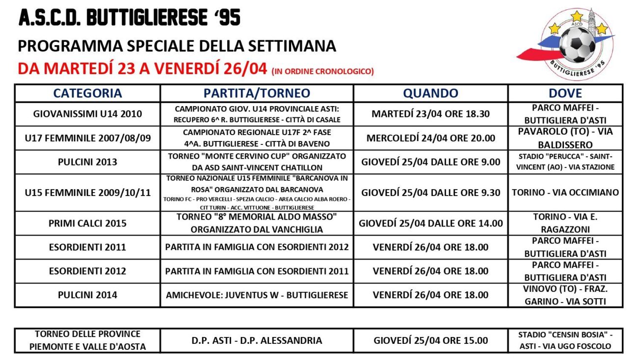 Di seguito alleghiamo il programma delle attività che coinvolgono le nostre squadre da martedì 23/04 a venerdì 26/04. Si parte mercoledì 23/04 con il recupero di campionato dei Giovanissimi U14 2010 in casa con una società storica come il Casale. Si prosegue mercoledì 24/04 alle ore 20.00 a Pavarolo con la gara del campionato regionale U17 Femminile con il Città di Baveno. Sempre nel femminile bel torneo per U15 Femminile giovedì 25 aprile sul campo di un’importante società torinese come il Barcanova: torneo a carattere nazionale con la presenza tra le altre di Torino FC, Pro Vercelli, Spezia Calcio. Altro campo importante nella città di Torino quello del Vanchiglia dove giovedì pomeriggio scenderanno in campo i Primi Calci 2015. Bell’esperienza anche per i Pulcini 2013 che andranno, con trasferta in pullman, a Saint-Vincent (AO) a disputare la “Monte Cervino Cup” allo stadio “Perucca”, dove andava in ritiro la Juventus negli anni di Antonio Conte. A proposito di Juventus venerdì 26/04 i nostri Pulcini 2014, con due ragazze in porta, Martina Luzzi e Sofia Agiurgioaie (2015) sfideranno la Juventus Women pari età a Vinovo (impianto del Garino). Intanto, sempre venerdì, gli Esordienti 2011 e 2012 scenderanno in campo per un torneo in famiglia a gruppi misti. Sabato 27 e domenica 28 aprile attività regolare con la particolarità dell’inizio del nostro torneo “Sfoglia Torino Football Cup 2024” per le categorie Primi Calci 2015 e 2016 nella giornata di domenica al Parco Maffei. Seguirò poi programma dettagliato del week-end come al solito sulle nostre pagine Instagram e Facebook.