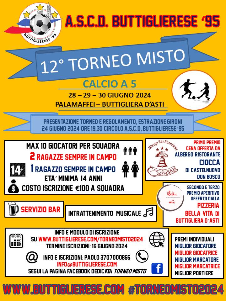 Il Torneo Misto è un torneo amatoriale di calcio a 5 organizzato dall’A.s.c.d. Buttiglierese ’95 presso la palestra comunale “PalaMaffei” di Buttigliera d’Asti (campo indoor) che prevede la presenza di due ragazze sempre in campo (e di almeno un ragazzo). L’età minima per partecipare è 14 anni, il costo dell’iscrizione è di € 100 a squadra (pagabili in contanti o con Satispay). Le partite si svolgeranno venerdì e sabato dalle ore 18.30/19.00 alle 24.00 circa e domenica dalle ore 16.00 circa. Durante la manifestazione saranno attivi il servizio bar e lo stand gastronomico. Al termine dell’evento si svolgeranno le premiazioni: coppe per le prime tre squadre classificate e premi individuali per miglior giocatore, miglior giocatrice, miglior marcatore e marcatrice e per il miglior portiere. Inoltre grazie all’Albergo-Ristorante “Ciocca” di Castelnuovo Don Bosco la prima squadra classificata vincerà anche un buono per una cena per 10 persone [Profilo Facebook: Albergo-Ristorante Ciocca]. Per la seconda e la terza qualificate invece la pizzeria “Bella Vita” di Buttigliera d’Asti offrirà un super aperitivo con tagliere ricchissimo [Profilo Facebook: Pizzeria Bella Vita].