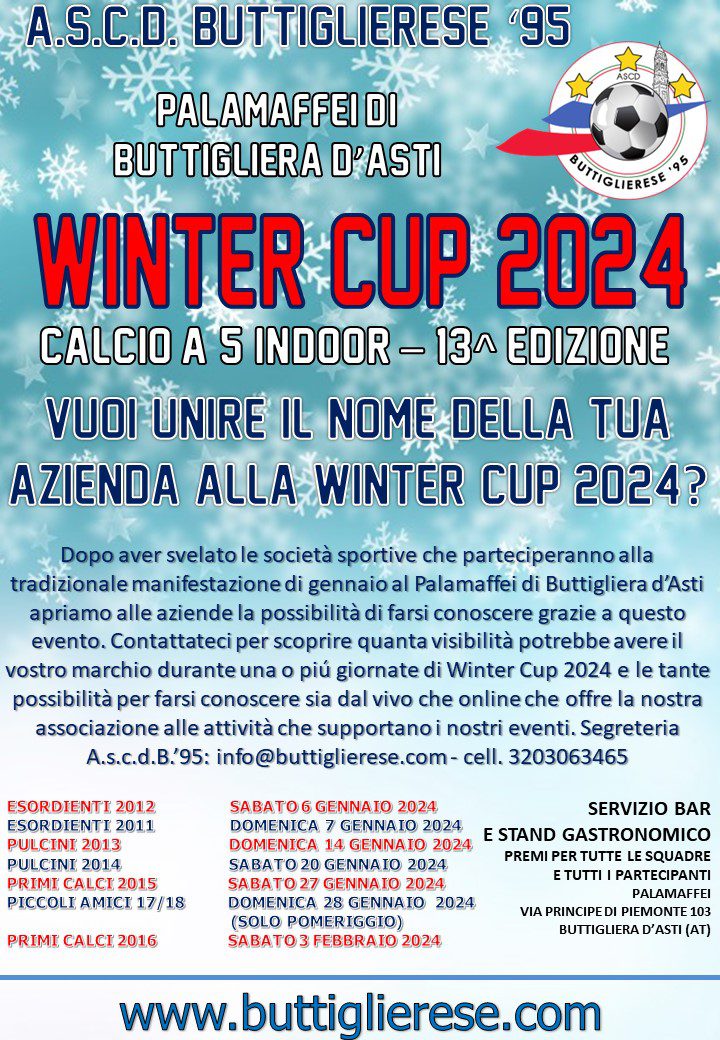 Di seguito la locandina con i loghi delle squadre partecipanti e date ed info del tradizionale torneo di calcio a 5 riservato all’Attività di Base che si svolgerà nel mese di gennaio al Palamaffei di Buttigliera d’Asti. Durante l’intera giornata saranno attivi presso la struttura servizio bar e stand gastronomico per tutte le squadre e per il pubblico. In caso di necessità di ulteriori informazioni rispetto a quelle riportate in locandina è possibile contattare il responsabile organizzativo del Settore Giovanile Marco Tamagnone al 3336690043.
