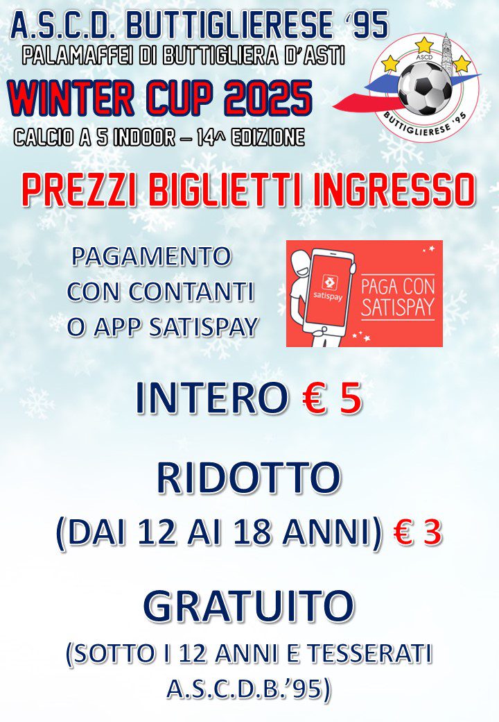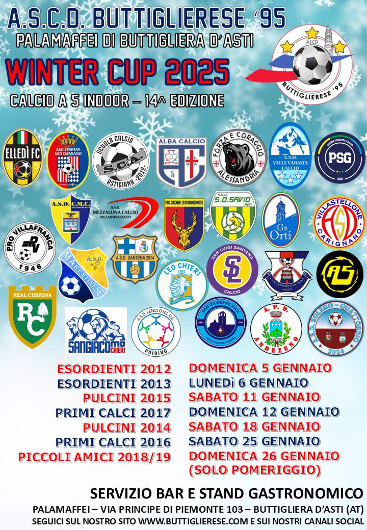 Anche quest’anno è il momento della Winter Cup, l’ormai tradizionale torneo di calcio a 5 riservato all’Attività di Base che arriva in questa stagione alla 14^ edizione. Il torneo vuole proporre alle squadre, anche a quelle che non lo fanno durante la stagione, la possibilità di confrontarsi nella disciplina del calcio a 5. La location è la solita: il Palamaffei di Buttigliera d’Asti. Non solo sport durante queste giornate che propongono un importante momento di aggregazione: la società organizza attività parallele di intrattenimento per i più piccoli durante i giorni di torneo a loro dedicati. Inoltre durante tutte le giornate di torneo saranno attivi bar e stand gastronomico a disposizione di squadre, staff e pubblico senza necessità di prenotazione. Sarà previsto un biglietto di ingresso per il pubblico al costo di € 5 (€ 3 ridotto per ragazzi dai 12 ai 18 anni, gratuito per tutti i tesserati A.s.c.d.B.’95 e i bambini sotto i 12 anni).
