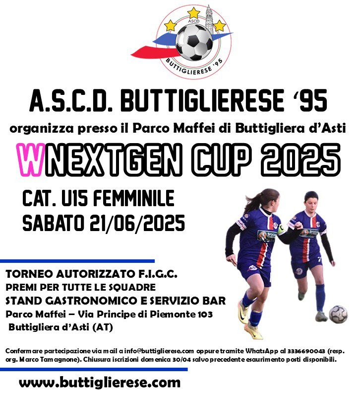 Si avvicina il momento del primo torneo nazionale dedicato alla categoria U15 Femminile organizzato dalla Buttiglierese ’95 che si svolgerà questo sabato 21 giugno 2025 al Parco Maffei di Buttigliera d’Asti (AT). Saranno con noi Juventus FC, Torino FC, Como Women FC e Bulè Bellinzago. Si tratta di un appuntamento importante in casa A.s.c.d.B.’95 che ci rende orgogliosi del nostro percorso nel mondo del calcio femminile. Servizio bar e stand gastronomico aperto a tutti. Sotto la locandina con i loghi delle società partecipanti che trovate di seguito ci sono anche, in versione PDF, il calendario del torneo e le info per l’ingresso del pubblico. Grazie a MA.GA.SAS per il supporto in questa iniziativa.